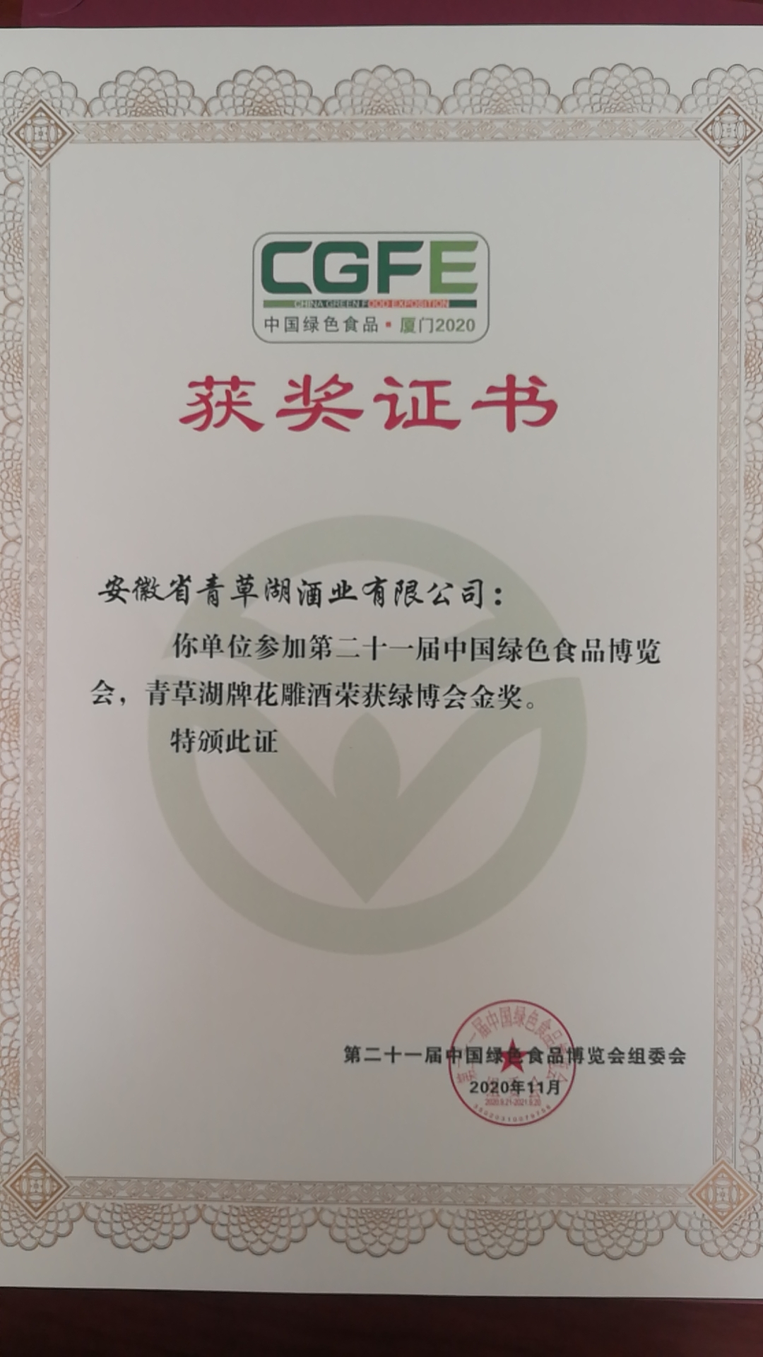 中国绿色博览会青草湖牌花雕酒荣获绿博会金奖